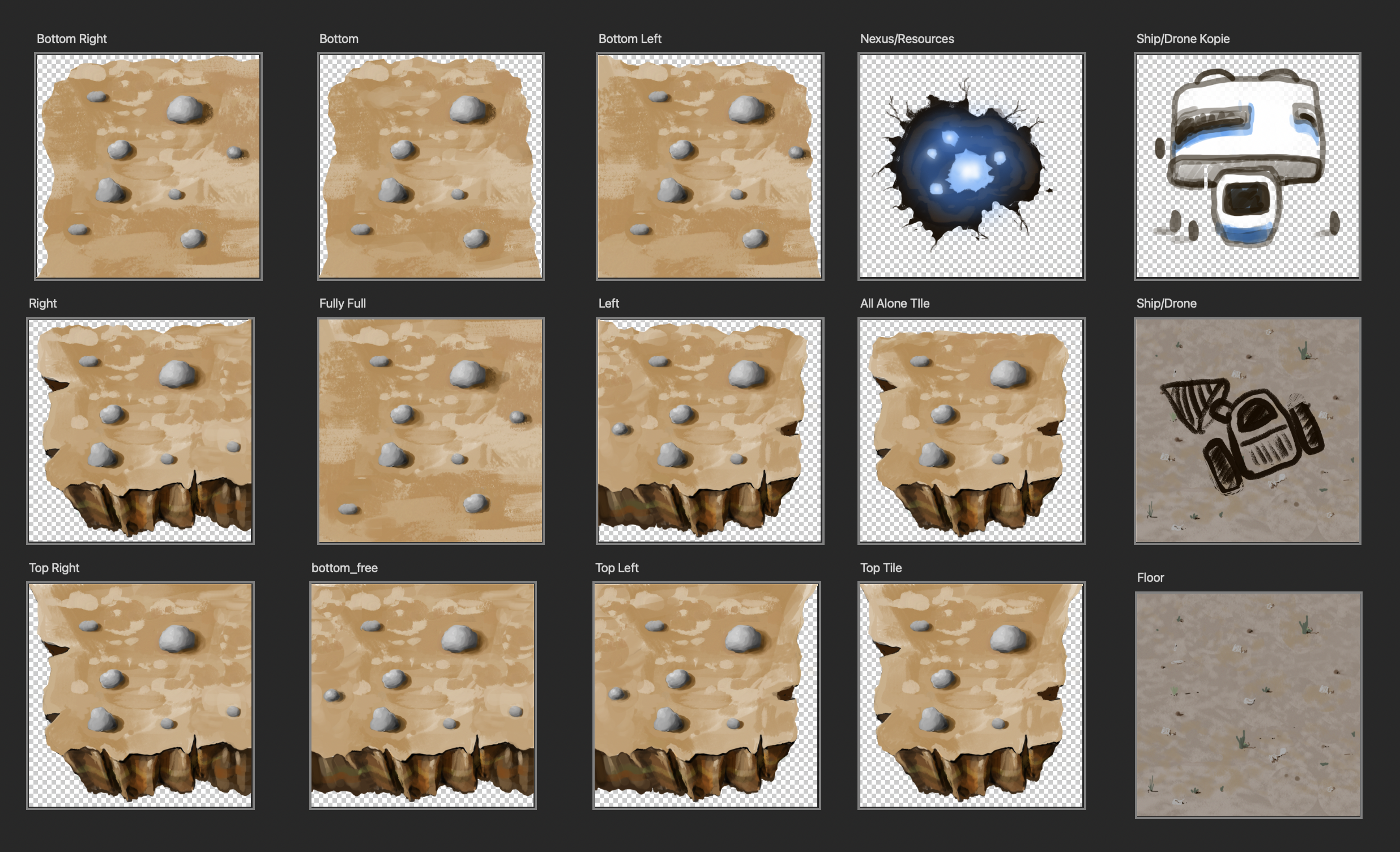 Painted all necessary tiles (minus one I forgot, the top-to-bottom-connected rock-tile). Still getting used to painting again. But it feels just like 20 years ago. Wacom and PS haven’t changed that much.