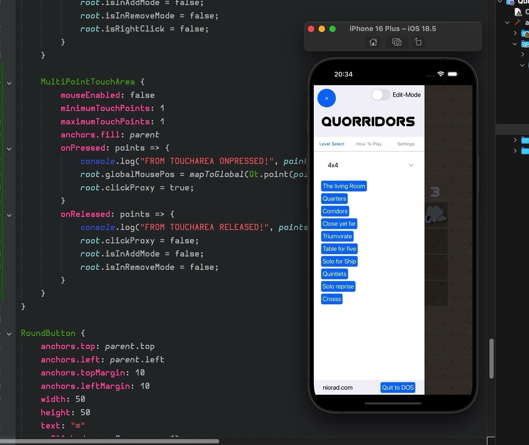 The game is running nicely on iOS! That means I can take it with me and make new levels on the go. I had to mess around a bit to combine MultiPointTouchArea and the normal mouse-handling, but it works surprisingly well!